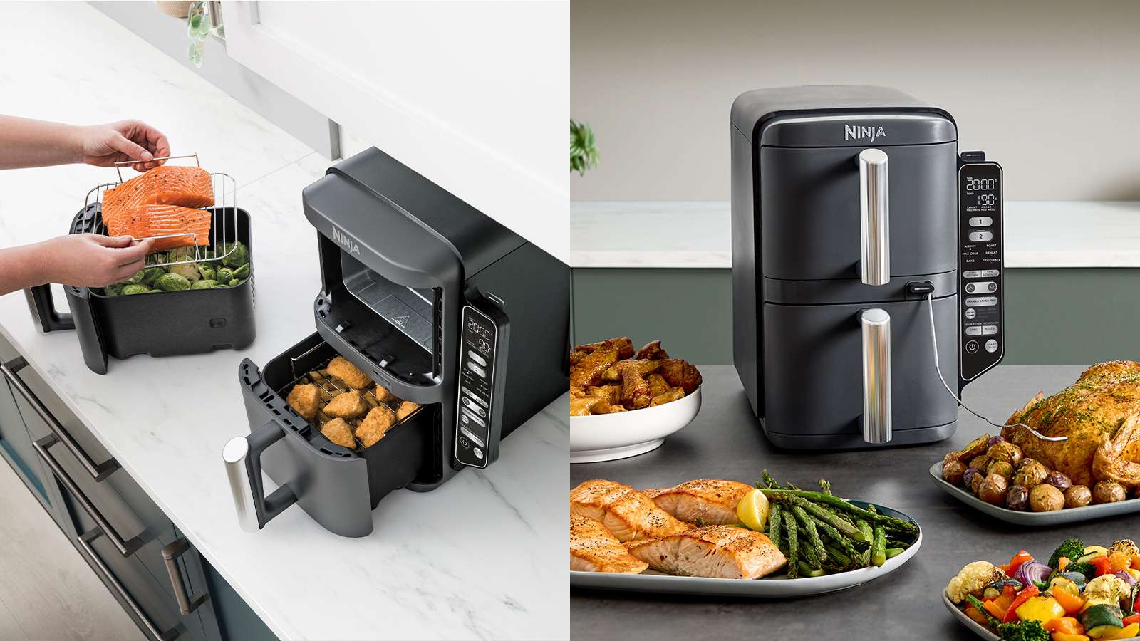 Esta freidora de aire con dos cajones es ideal para familias grandes e invitados, ya que en cada uno de los cajones de 4,75 l cabe un pollo asado entero de 1,5 kg. Perfecta para cocinar para 8 personas.
